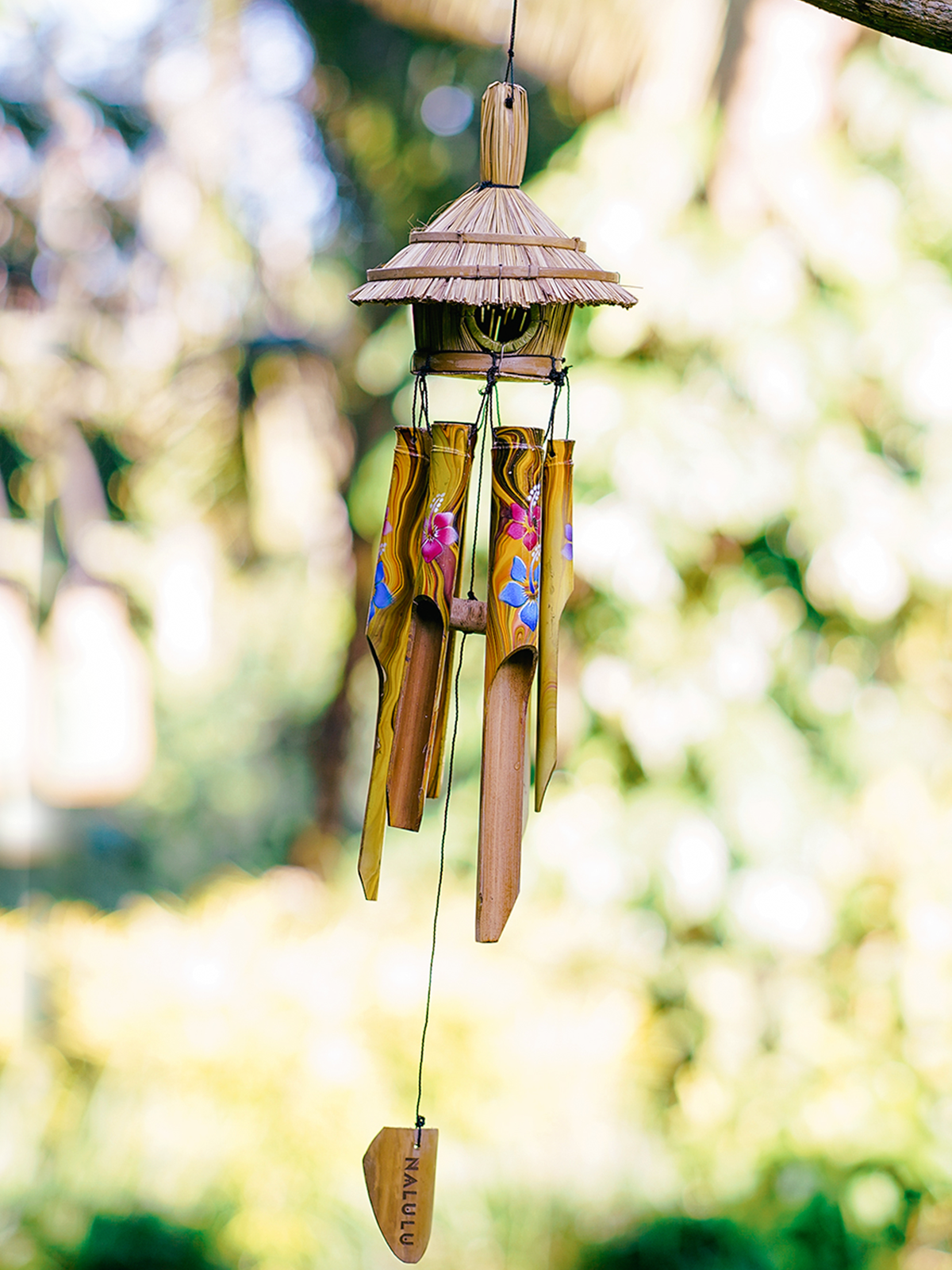 Each Flory Bamboo Wind Chime is individually hand-painted and stencilled by our artisans, giving it a vibrant, refined look that adds a unique decorative touch to any outdoor space.