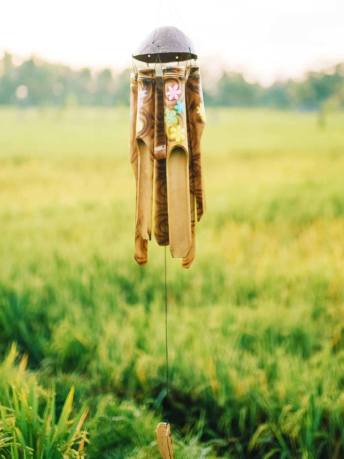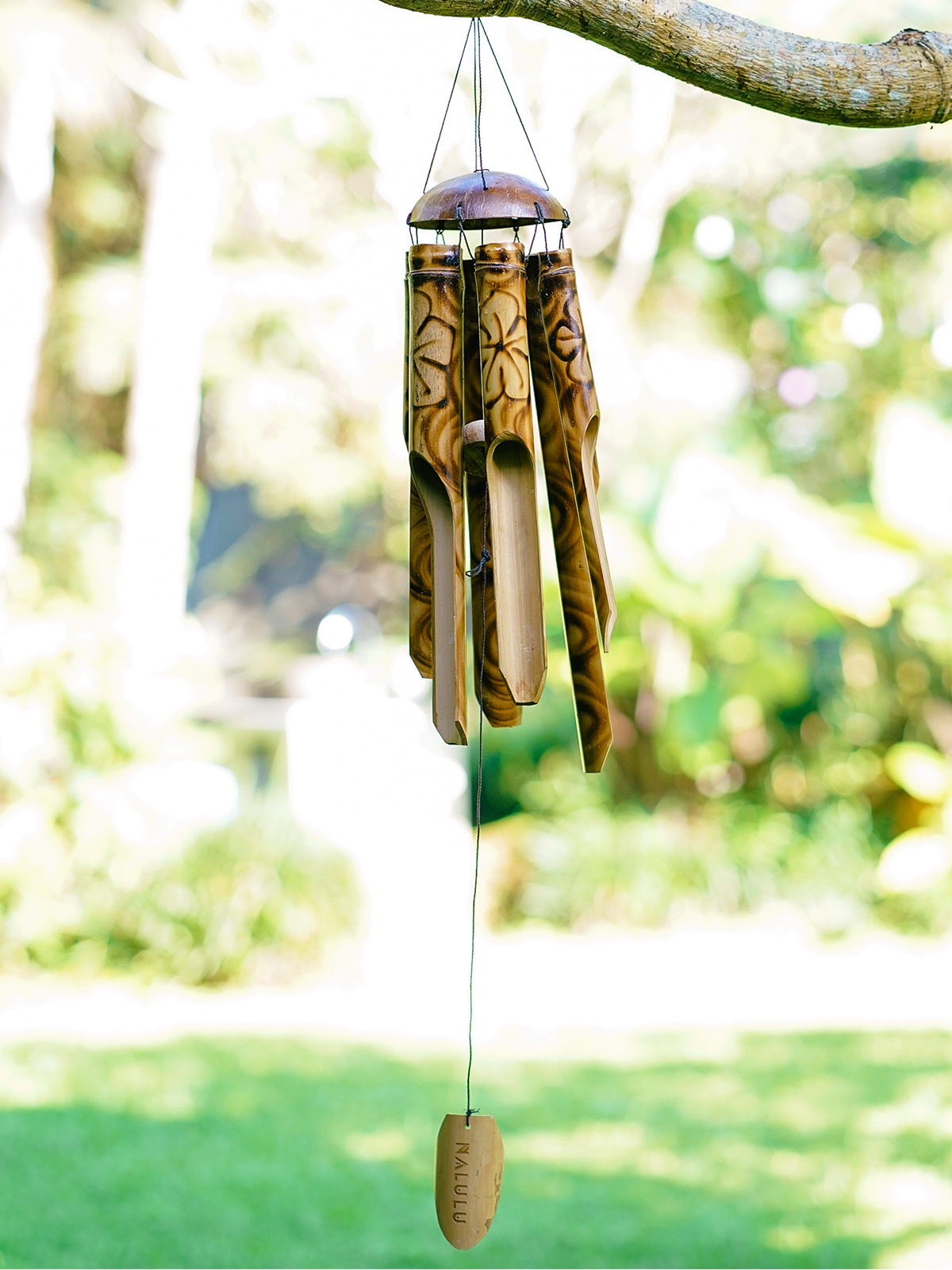 The Open-flame Burned Floral Bamboo Wind Chime Adds Rustic and Cool Vibes to Any Setting. Flowers are burned onto the chime using an open flame and then topped with a coconut, symbolizing a fresh start.